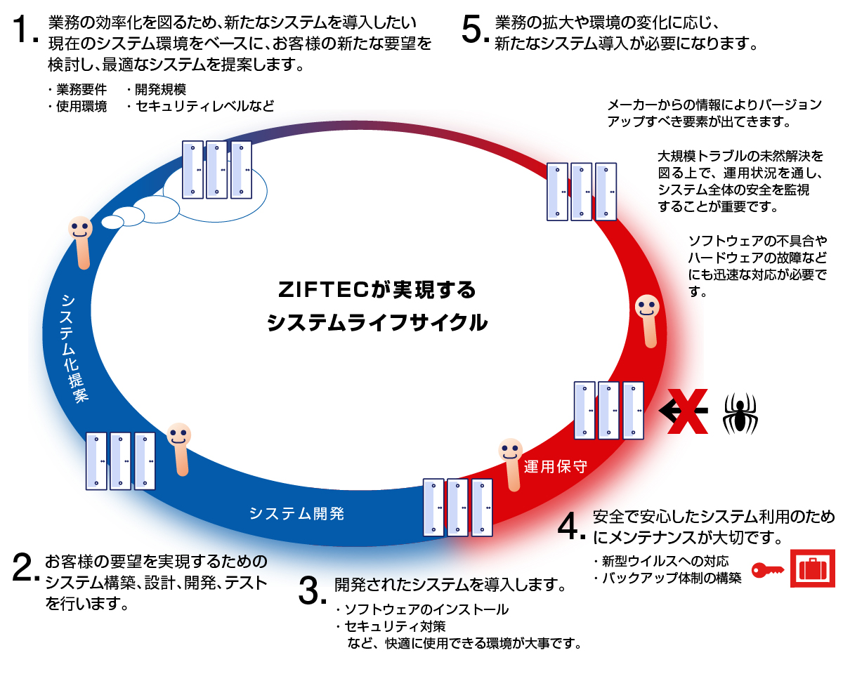 ゼオングループの情報システムの企画、開発・構築、運用、保守の全工程を担い、お客様満足度の高いシステムを提供しています